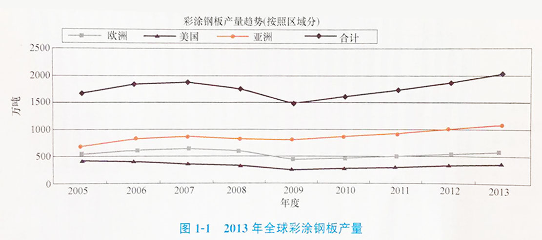 根據日本相關公同的統計,2013年全球彩涂鋼板產量約2000萬噸(圖1-1),其中歐洲年產量約500萬噸,美國約400萬噸,亞洲約1100萬噸。根據歐洲卷材協會(ECCA)、美國卷材協會(NCCA)統計顯示:2016年歐洲(不含俄羅斯)彩涂鋼板年產量約500萬噸,美國約400萬噸,處于平穩發展期(圖1-2)。近年俄羅斯新建彩涂機組較多,產量呈現上升趨勢,年產量約70萬噸(圖1-3)。