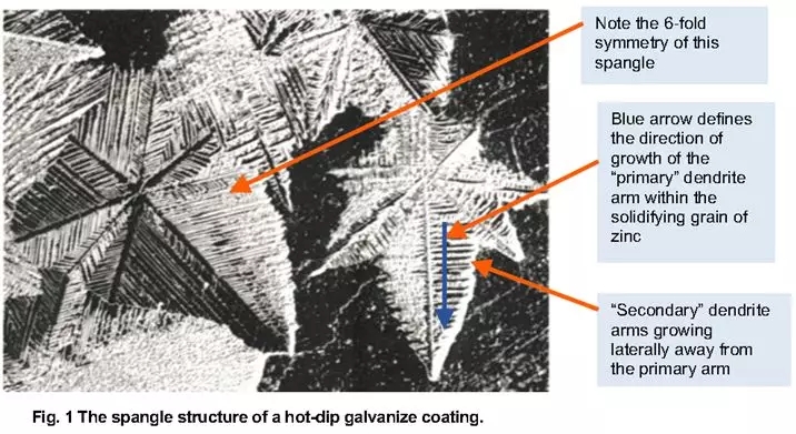 鋅花的形狀取決于鋅液中所添加合金的種類,如選擇鉛、銻可獲得鳳尾狀鋅花;選擇鉛、錫則得到羊齒狀鋅花等等。