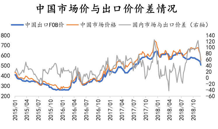 首先在11月下旬中國FOB價格出現大幅的下跌,鋼廠接受海外訂單量增加,并且11月中旬重點鋼企粗鋼日均產量195.15萬噸。11月中旬重點鋼企粗鋼日均產量195.15萬噸,旬環比增加3.51萬噸,增長1.83%。截至11月中旬末,重點鋼鐵企業鋼材庫存量為1327.11萬噸,旬環比增加104.23萬噸,上升8.52%。從鋼企日均產量可以看出,目前鋼材產量還是在不斷上升中,決定目前鋼市價格的還是下游的終端需求,但目前市場供大于求的狀況未有改變,并且國內貿易商冬儲意向并不明顯,且部分地區出現停工現象,導致鋼廠出口意愿增加。另外中美貿易戰進入90天“?;鹌凇?,這也利好鋼材的出口增加。綜合來看,12月份出口量或接近600萬噸,同環比均會有所上漲。