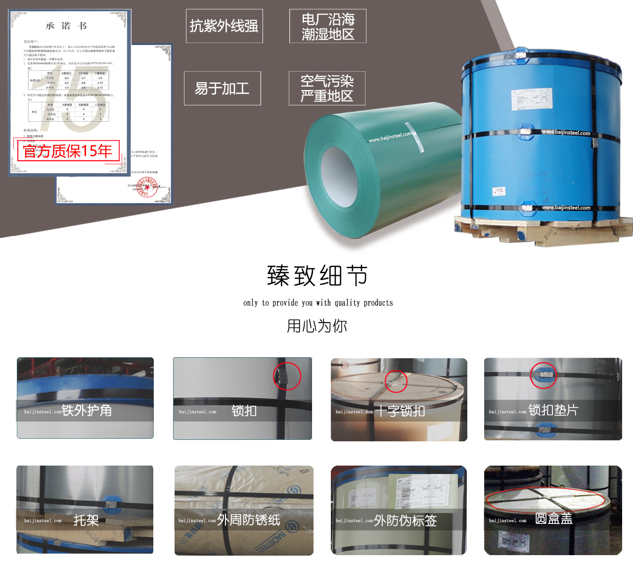 HDP高耐候彩涂板采用HDP聚脂涂料,耐久性好,采用高分子量的樹脂,聚合物支鏈少,鍵能穩定,不易光解因此不易粉化,光澤度降高。高耐候性聚脂的主要性能為耐氣候能力高和抗腐蝕能力強,主要用于日照時間較長,干燥度高,或是晝夜溫差較大,濕度強比較惡劣的地區。用途廣泛。屬于彩涂板卷的高端產品。涂層厚度一般為正面5UM環氧樹脂底漆+20UM HDP聚脂面漆,反面為5UM環氧樹脂底漆+6UMPE樹脂面漆。